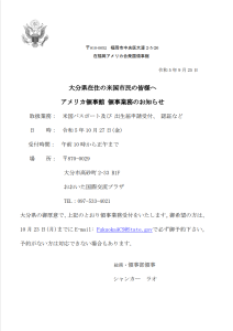 Given Oita’s distance from Fukuoka, the Consulate would like to make sure we have enough interested American customers to justify our visit. We therefore ask that all interested customers contact us to schedule an appointment for services by no later than Monday, October 23. You can schedule an appointment by contacting consular staff by e-mail: FukuokaACS@state.gov. If you wait and call us on the day of our visit, we may not be able to accommodate your request for an appointment.