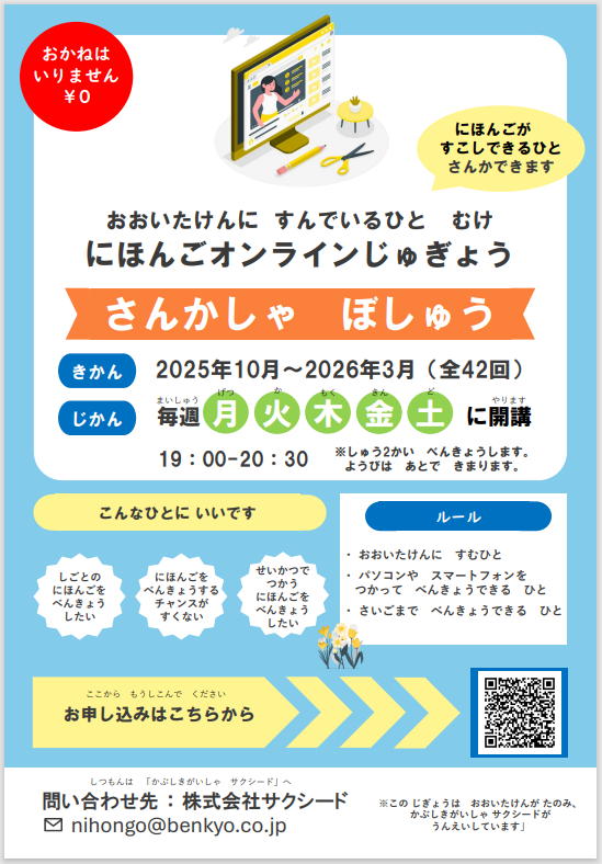 日本語(にほんご)を勉強(べんきょう)できる講座(こうざ)がスタート(すたーと)します!