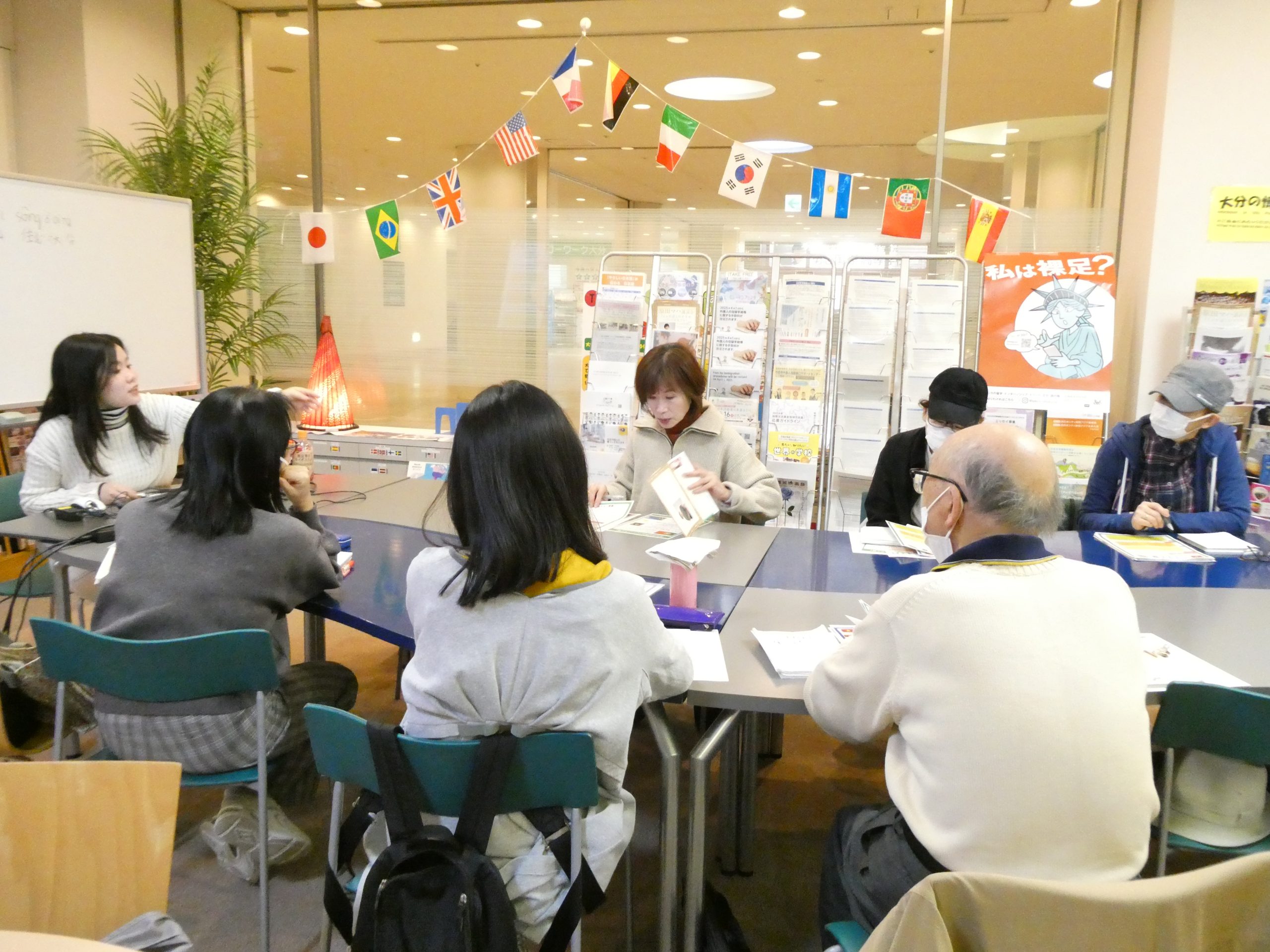 その後、講師が準備した資料を使って「今何時ですか」「今は〇〇時です」のフレーズを学習しました。フレーズ自体は短いですが、時間を伝えるには単語だけでなく数字も必要になるため、参加者のみなさんは苦戦しながらも、ペアワークを通じて繰り返し練習していました。