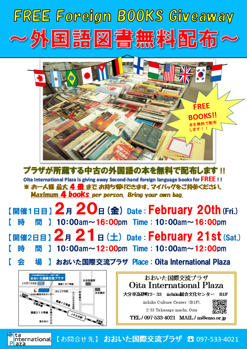 Hello from the Oita International Plaza! Help recycle books by coming to our FREE FOREIGN BOOK GIVEAWAY! Maximum 4 books per person. Bring your own bag.