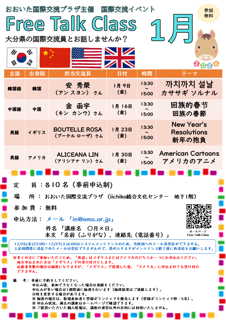 | 申込先(メール) | in@emo.or.jp 件名「Free Talk Class ○月×日 ▲△語」 本文「名前(ふりがな)、連絡先(電話番号)」 ※多くの方にご参加いただくため、「英語」はイギリスまたはアメリカのどちらか一つにお申込みください。 |