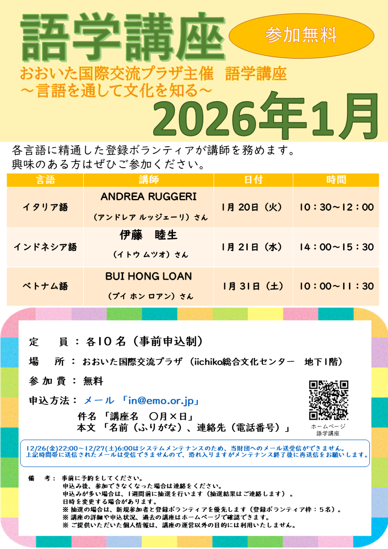 | イタリア語 | ANDREA RUGGERI(あんどれあ るっじぇーり)さん | 1月20日(火) 10時30分~12時 | 10名 | 8名申込みがありました |