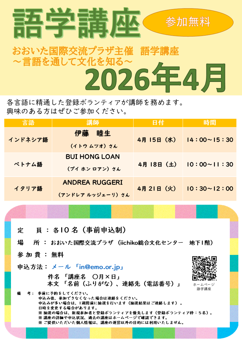 | イタリア語 | ANDREA RUGGERI(あんどれあ るっじぇーり)さん | 4月21日(火) 10時30分~12時 | 10名 | 4名申込みがありました |